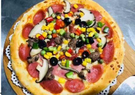 5. 将披萨放入预热好的烤箱中,烘烤至金黄色即可。